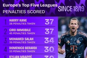 NBA直播11月21日讯 Squawka统计了2018-2019赛季以来球员在五大联赛的点球进球数量,并列出榜单,凯恩、因莫比莱37球居首,萨拉赫34球第三。