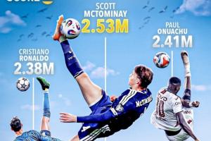 据Score 90统计,麦克托米奈的这粒倒钩进球创造了新的世界纪录,成为有史以来脚尖高度最高的倒钩进球,超越了C罗在2018年对阵尤文时的经典倒钩,以及奥努阿楚今年早些时候对阵卡拉古拉克时创造的纪录。