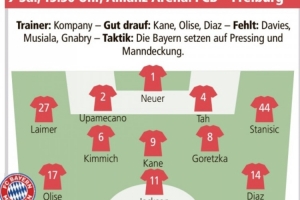 NBA直播11月22日讯 拜仁将在本轮德甲焦点战坐镇主场对阵弗赖堡,德媒《慕尼黑日报》也预测了拜仁首发。