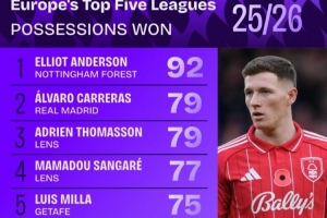 NBA直播11月22日讯 五大联赛战火即将重燃,数据机构squakwa也统计了本赛季至今的五大联赛球员赢得球权次数情况,诺丁汉森林中场埃利奥特·安德森居首。