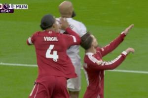 24体育直播:2025年10月19日讯 英超第8轮利物浦vs曼联,曼联先进一球,第1分钟姆伯莫破门。进球前的争顶,范迪克争顶中肘击麦卡利斯特!