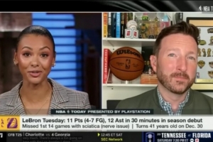 NBA直播11月22日讯 今天的《NBA Today》节目,主持人Malika Andrews连线了自己的老公、湖人随队记者Dave McMenamin,聊到了詹姆斯复出后的安排。