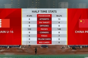 NBA直播11月22日讯 U17亚预赛第一轮,国少队半场3-0领先巴林队,数据方面,国少队半场13射4正3进球,对手0射门。