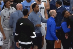 GIF-比赛结束后 场上的克莱和场边的莫兰特吵起来了