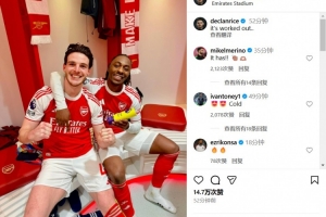 NBA直播11月24日讯 英超第12轮的北伦敦德比,阿森纳以4-1的比分大胜热刺。赛后,枪手中场赖斯在社交媒体上庆祝了这场重要的胜利。