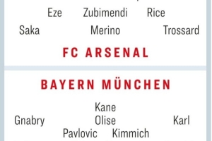 NBA直播11月24日讯 拜仁和阿森纳在本轮联赛各自取得大胜,两队也将在周中迎来欧冠榜首之争,拜仁作客挑战阿森纳。《踢球者》也预测了双方首发: