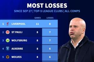 NBA直播11月24日讯 德转统计了自9月27日以来五大联赛球队的输球榜,利物浦以8场比赛高居榜单第一位。