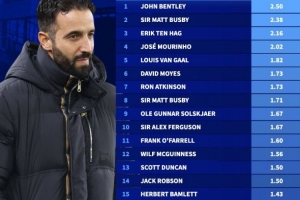 NBA直播11月25日讯 《转会市场》统计了阿莫林执教第一年在老特拉福德的场均拿分情况,1.43分仅能位列队史第16位。
