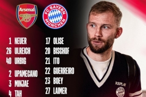 NBA直播11月25日讯 北京时间11月27日周四凌晨4点,欧冠联赛阶段第5轮,拜仁客战阿森纳,拜仁公布了此役球队大名单。