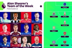 NBA直播11月26日讯 英超第12轮战罢,阿兰·希勒评本轮最佳阵容,皮克福德、埃泽、摩根·罗杰斯在列。