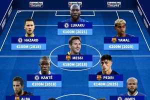 NBA直播11月26日讯 北京时间今晚凌晨4点,欧冠联赛阶段第5轮,切尔西主场迎战巴萨。赛前,德转评出这两支球队历史最贵11人阵容,其中梅西、亚马尔领衔锋线,阿扎尔、卢卡库在列。这套阵容的总身价达12.5亿欧元。