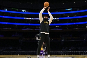 NBA直播11月26日讯 今日,湖人官推晒出一组前锋詹姆斯的赛前热身照。