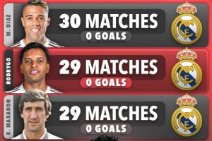 NBA直播11月26日讯 皇马前锋罗德里戈本赛季状态低迷,出战14场比赛1球未进。目前罗德里戈俱乐部连续进球荒已经长达29场,排名皇马队史第2,仅次于30场球荒的马里亚诺。罗德里戈上次代表皇马取得进球,还是今年3月对阵马竞的比赛。