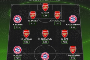 NBA直播11月27日讯 拜仁将在本轮欧冠客战阿森纳,whoscored也列出了两队本赛季欧冠评分合体最佳阵,阿森纳7将在列。