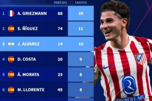 NBA直播11月27日讯 在本轮欧冠马竞2-1击败国米的比赛中,阿尔瓦雷斯破门,打进马竞生涯欧冠第10球。以下为马竞队史欧冠进球榜: