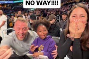 NBA直播11月28日讯 一位网友在Instagram上晒出了近日他们一家三口去观看湖人主场比赛时的花絮。