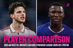 NBA直播11月28日讯 北京时间12月1日凌晨,切尔西将在英超第13轮比赛中主场对阵阿森纳,Opta对比了赖斯和凯塞多本赛季英超的数据。