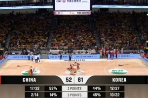 NBA直播11月28日讯 男篮世亚预阶段一,中国男篮三节52-61落后韩国男篮。