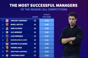 NBA直播11月28日讯 本赛季五大联赛中,拜仁和阿森纳均有着极为出色的表现。德国转会市场盘点了五大联赛主帅场均拿分情况,孔帕尼、阿尔特塔和阿隆索位居前三。值得一提的是,这三名主帅都是名副其实的少壮派。