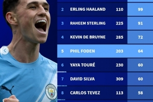 NBA直播11月30日讯 在本轮英超,曼城3-2击败利兹联,福登梅开二度。以下为曼城队史英超射手榜:
