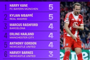 NBA直播10月23日讯 本赛季欧冠联赛阶段已战罢3轮,Squawka统计了到目前为止欧冠进球榜,拜仁前锋凯恩和皇马攻击手姆巴佩都打进5球,分列前二位。
