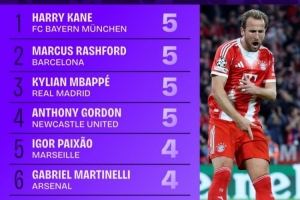 NBA直播10月23日讯 本赛季欧冠联赛阶段已战罢3轮,Squawka统计了到目前为止的参与进球榜,拜仁前锋凯恩、巴萨攻击手拉什福德、皇马的姆巴佩以及纽卡边锋安东尼-戈登均参与5球。