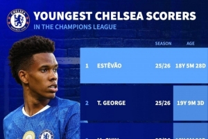 NBA直播10月23日讯 德国转会市场列出了切尔西队史欧冠最年轻进球者排名,埃斯特旺居首。