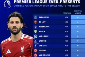 NBA直播12月1日讯 英超已经战罢13轮,《转会市场》统计了本赛季至今一分钟都未缺席的全勤非门将球员,共计16人: