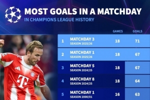 NBA直播10月23日讯 德国转会市场统计了欧冠单轮比赛进球数量,并列出欧冠历史单一轮次进球排名,本轮欧冠打进71球居首。