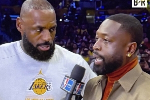 NBA直播12月2日讯 在上周六湖人对阵独行侠的比赛中,韦德现身场边采访詹姆斯。
