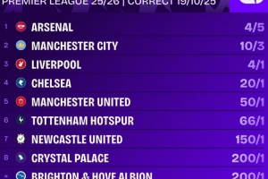 24体育直播:2025年10月20日讯 利物浦不敌曼联,遭遇联赛三连败。英超夺冠赔率方面,阿森纳以5赔4的赔率成为最大的夺冠热门。曼城以3赔10的赔率位居第二,利物浦则以1赔4的赔率排名第三。
