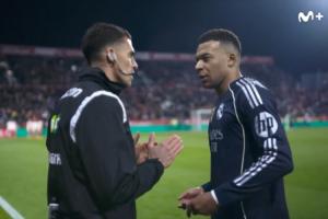 NBA直播12月02日讯 西甲第14轮皇马客场1-1战平赫罗纳,比赛中Movistar的镜头捕捉到了姆巴佩与场边第四官员亚历杭德罗·克莱门特的一次言语冲突。