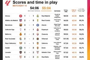 NBA直播12月2日讯 数据显示,赫罗纳1-1皇马是第14轮西甲净时间最长的比赛。