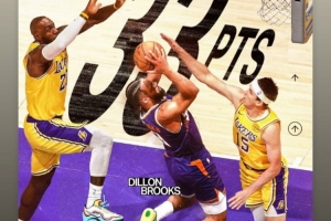赛后,狄龙转发了一张自己上篮的照片,而詹姆斯和里夫斯当了背景板,还有他的得分。