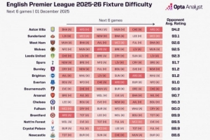 NBA直播12月2日讯 opta分析了英超各队未来6轮的赛程难易程度,维拉赛程最为艰难,利物浦最容易。曼城第二容易,曼联并列第三容易。