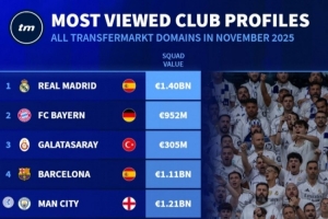 NBA直播12月3日讯 德转列出了11月份俱乐部页面浏览量排名,皇马、拜仁、加拉塔萨雷前三。