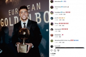 NBA直播12月3日讯 在《都灵体育报》主办的欧洲金童奖颁奖典礼上,杜埃领取了2025年金童奖杯。