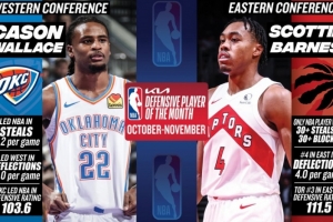 NBA直播12月3日讯 今日NBA官方公布了10-11月东西部月最佳防守球员,雷霆球员卡森·华莱士和猛龙球员斯科蒂·巴恩斯分别当选。