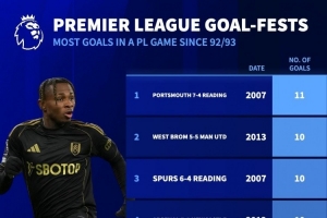 NBA直播12月3日讯 英超第14轮比赛,曼城客场5-4击败富勒姆。德国转会市场指出,英超历史上只有6场比赛的进球数量多于此役。