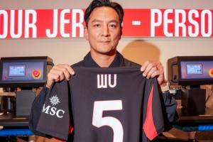 NBA直播10月24日讯 AC米兰官博更新动态,晒出影星吴彦祖与米兰球衣的合照,球衣印号是5号的“WU”。
