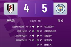 NBA直播12月03日讯 英超第14轮,曼城5-4击败富勒姆,曼城一战丢4球,防守堪忧。