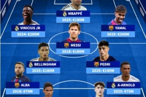 NBA直播10月24日讯 本周末,西甲将上演万众瞩目的西班牙国家德比。德国转会市场盘点了皇马和巴萨球员历史身价最高阵,梅西、姆巴佩、亚马尔等悉数在列。