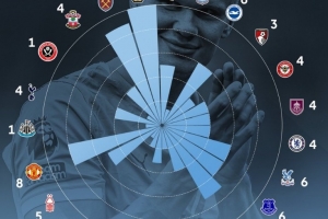 NBA直播12月3日讯 哈兰德达成英超百球里程碑,英超官方也晒出哈兰德百球攻破球门对手分布,具体如下: