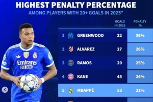 NBA直播12月4日讯 《转会市场》统计了2025年五大联赛各项赛事进球超过20球的球员的点球占比情况,格林伍德独自领跑。