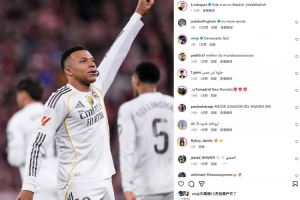 本场比赛姆巴佩2射1传,赛后他也在社媒晒出本场庆祝进球的照片,配文写道:“这就是我的皇马。加油,马德里!”