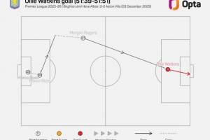 NBA直播12月4日讯 维拉在本轮英超对阵布莱顿,罗杰斯助攻沃特金斯破门。