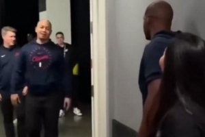 NBA直播12月7日讯 今天,多家美媒晒出视频,保罗正在和一个女性聊天,泰伦·卢走过来和后者拥抱一下。