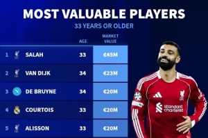 NBA直播12月7日讯 德国转会市场统计了年龄33+球员的身价,并列出榜单,萨拉赫4500万欧居首,梅西1800万欧第七。