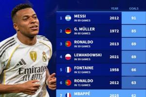 NBA直播12月08日讯姆巴佩今年进球已达62球,进入历史前十,德转盘点了足坛历史自然年进球纪录。