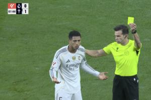 NBA直播12月08日讯 皇马本轮0-2不敌塞尔塔,皇马本场场上球员两人被罚下。第60分钟时,贝林厄姆遭伊格莱西亚斯肘击,贝林头部出血,这下对方没有吃牌。